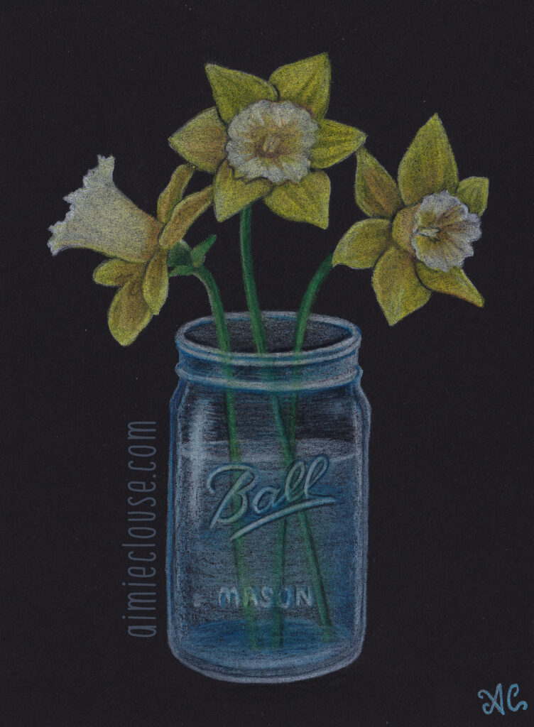 Jar of DaffodilsAimie ClouseApril 20, 2026⭐️ Traditional Prismacolor Premier colored pencils on black cardstock 4.75″ x 6.5″ Related